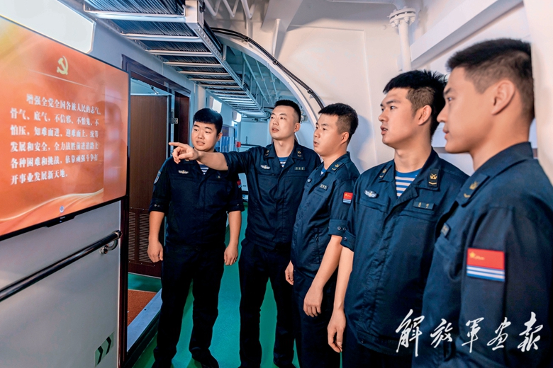 海軍第42批護(hù)航編隊(duì)官兵利用通道櫥窗等形式學(xué)習(xí)黨的二十大報(bào)告。(攝影/王 青)