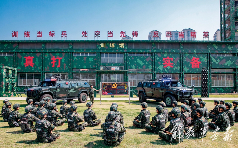 武警廣西總隊(duì)機(jī)動(dòng)支隊(duì)在訓(xùn)練間隙組織官兵學(xué)習(xí)討論黨的二十大報(bào)告的心得體會(huì)。(攝影/劉 明)