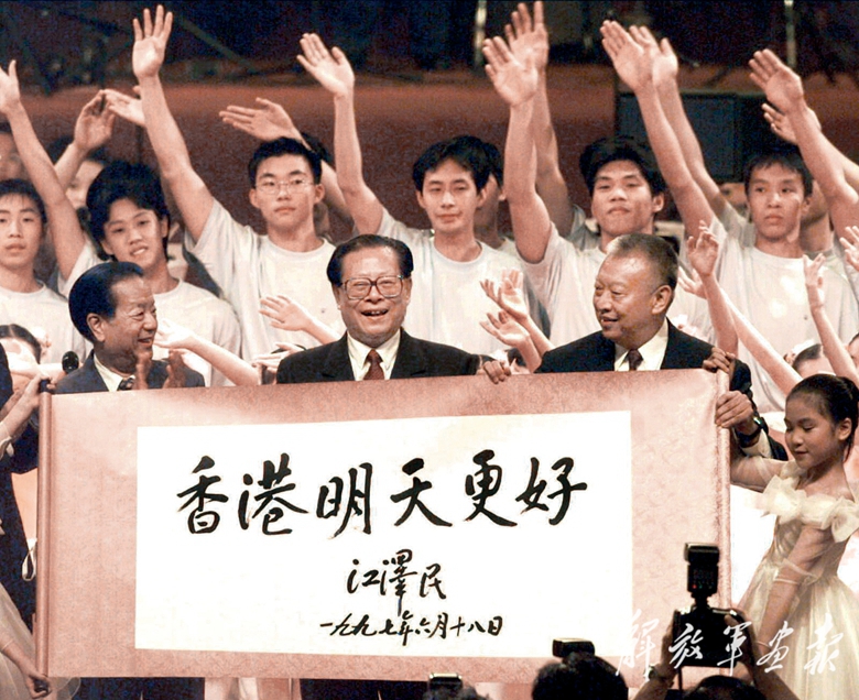 1997年7月1日上午10時(shí),中華人民共和國(guó)香港特別行政區(qū)成立慶典在香港會(huì)展中心新翼舉行。在慶典儀式上展示了江澤民同志親手題寫的“香港明天更好”書法卷軸。