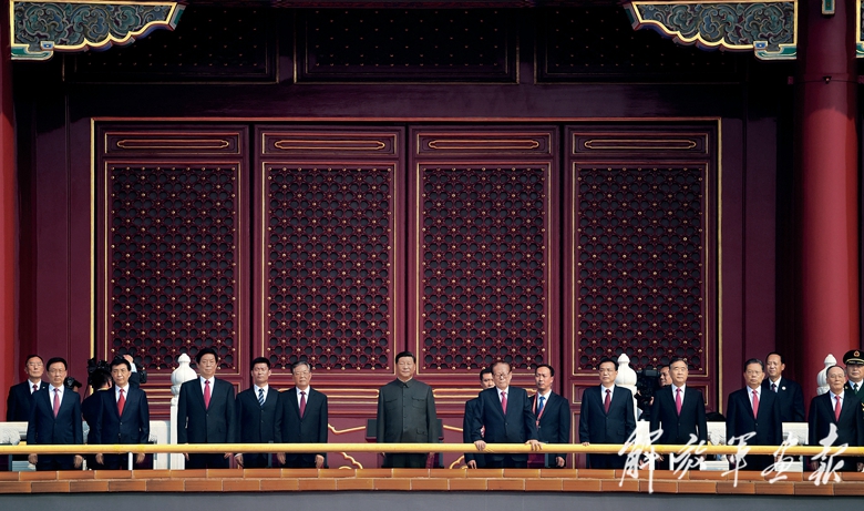 2019年10月1日,慶祝中華人民共和國(guó)成立70周年大會(huì)在北京天安門廣場(chǎng)隆重舉行。這是習(xí)近平同志、江澤民同志、胡錦濤同志等在天安門城樓上。