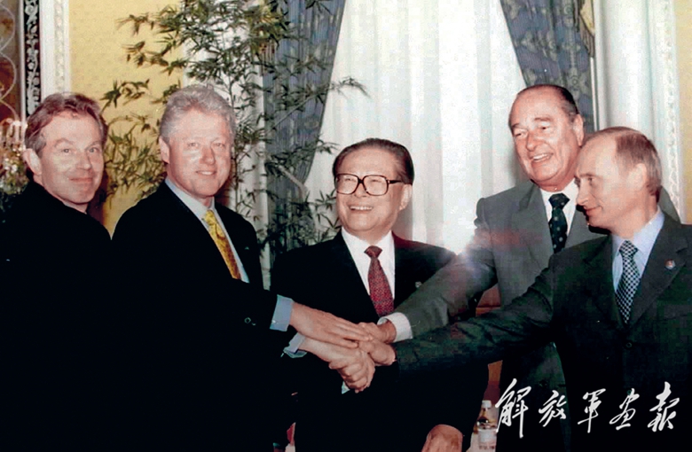 2000年9月7日,由中國(guó)倡議的聯(lián)合國(guó)安理會(huì)五個(gè)常任理事國(guó)首腦會(huì)議在紐約舉行。江澤民同志(中)同法國(guó)總統(tǒng)希拉克(右二)、俄羅斯總統(tǒng)普京(右一)、英國(guó)首相布萊爾(左一)、美國(guó)總統(tǒng)克林頓(左二)握手合影。