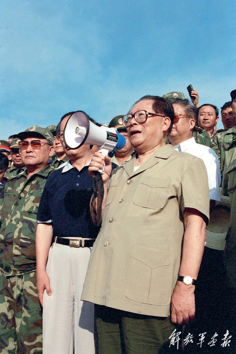 1998年8月13日至14日,江澤民同志親赴湖北長(zhǎng)江抗洪搶險(xiǎn)第一線,看望、慰問(wèn)、鼓勵(lì)奮戰(zhàn)在抗洪搶險(xiǎn)第一線的廣大軍民,指導(dǎo)抗洪搶險(xiǎn)斗爭(zhēng)。這是8月13日江澤民同志在洪湖市烏林鎮(zhèn)中沙角險(xiǎn)段大堤上,向正在抗洪搶險(xiǎn)的軍民發(fā)表講話。