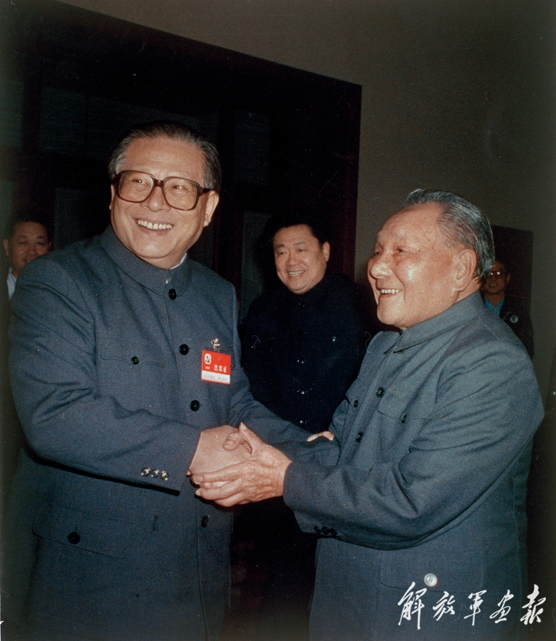 1989年11月6日至9日,中國(guó)共產(chǎn)黨第十三屆中央委員會(huì)第五次全體會(huì)議在北京召開。這是鄧小平同志和江澤民同志親切握手。