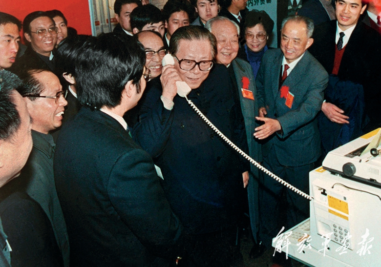 1984年5月,江澤民同志在北京展覽館舉行的全國(guó)電子新產(chǎn)品展覽會(huì)上,試用國(guó)際長(zhǎng)途電話向遠(yuǎn)方的工作人員問(wèn)候。