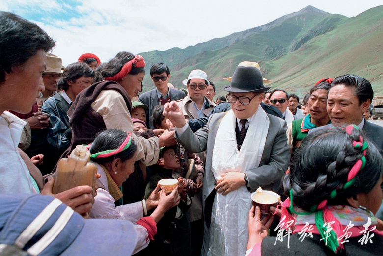 1990年7月25日,江澤民同志與藏族群眾共慶望果節(jié)。