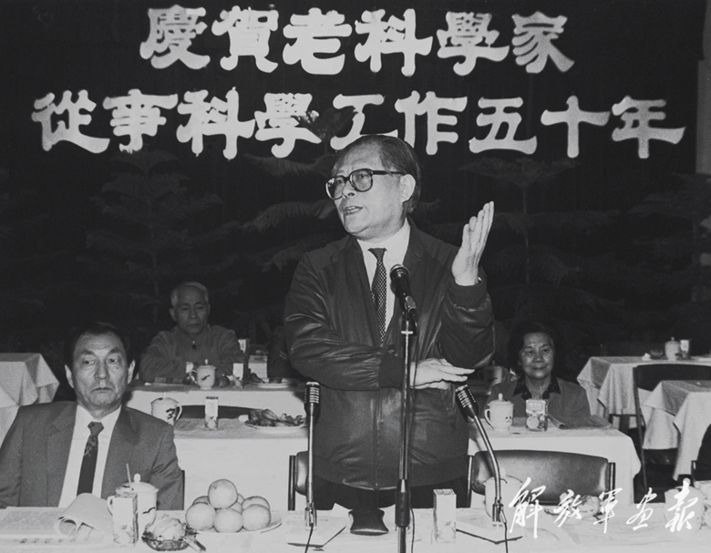 1988年10月,江澤民同志在上海慶賀老科學(xué)家從事科學(xué)工作五十年座談會(huì)上講話。