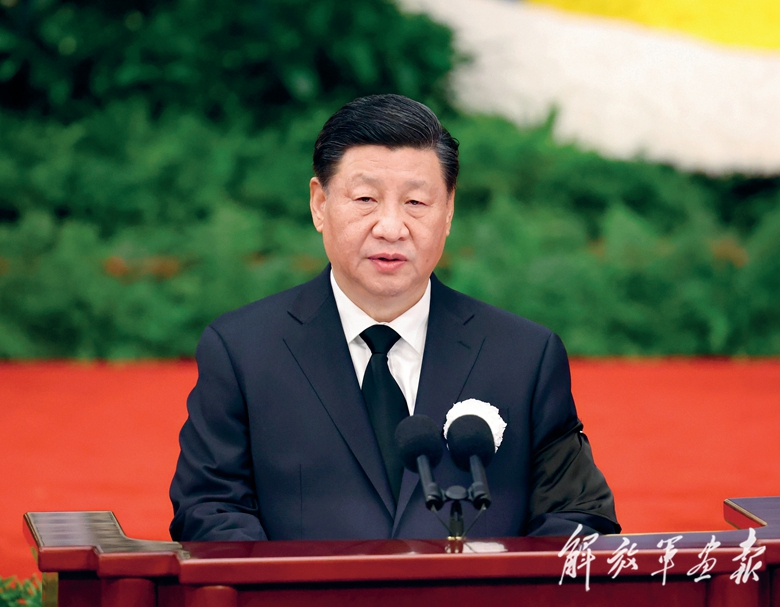 在全場凝重的氣氛中,習(xí)近平致悼詞。習(xí)近平在悼詞中高度評價了江澤民同志光輝的一生和建立的豐功偉績。他指出,從黨的十三屆四中全會到黨的十六大的13年中,國際形勢風(fēng)云變幻,我國改革開放和社會主義現(xiàn)代化建設(shè)進(jìn)程波瀾壯闊。在國際國內(nèi)十分復(fù)雜的形勢下,江澤民同志帶領(lǐng)黨的中央領(lǐng)導(dǎo)集體,高舉馬克思列寧主義、毛澤東思想、鄧小平理論偉大旗幟,堅持黨的基本路線不動搖,緊緊依靠全黨全軍全國各族人民,堅定不移堅持和發(fā)展中國特色社會主義。江澤民同志深刻洞察世界新軍事變革的發(fā)展趨勢,主持制定了新時期軍事戰(zhàn)略方針,強(qiáng)調(diào)要推進(jìn)中國特色軍事變革,堅定不移走中國特色的精兵之路,加強(qiáng)人民軍隊革命化、現(xiàn)代化、正規(guī)化建設(shè)。在江澤民同志親自領(lǐng)導(dǎo)和大力推動下,我國國防和軍隊現(xiàn)代化建設(shè)取得了巨大成就。江澤民同志集中全黨智慧創(chuàng)立了“三個代表”重要思想,進(jìn)一步回答了什么是社會主義、怎樣建設(shè)社會主義的問題,創(chuàng)造性回答了建設(shè)什么樣的黨、怎樣建設(shè)黨的問題,深化了我們對新的時代條件下推進(jìn)中國特色社會主義事業(yè)、加強(qiáng)黨的建設(shè)的規(guī)律的認(rèn)識,以新的思想、觀點(diǎn)、論斷,繼承、豐富、發(fā)展了馬克思列寧主義、毛澤東思想、鄧小平理論。