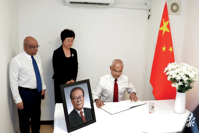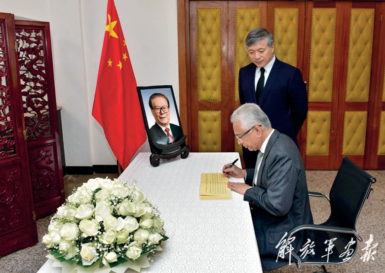12月2日,毛里求斯總理賈格納特在中國(guó)駐毛里求斯大使館吊唁江澤民同志。(中國(guó)駐毛里求斯大使館供圖)