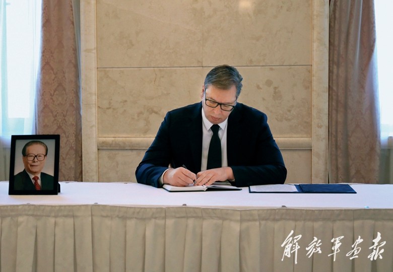 12月3日,塞爾維亞總統(tǒng)武契奇在中國(guó)駐塞爾維亞大使館吊唁江澤民同志。(中國(guó)駐塞爾維亞大使館供圖)