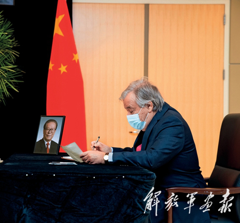 12月5日,聯(lián)合國(guó)秘書長(zhǎng)古特雷斯在中國(guó)常駐聯(lián)合國(guó)代表團(tuán)駐地吊唁江澤民同志。(攝影/新華社記者 王 迎)