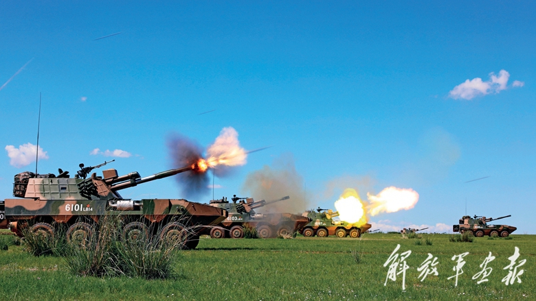 炮兵群對(duì)“敵”陣地進(jìn)行火力急襲。