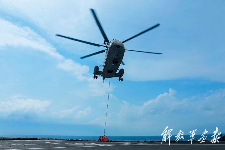 此時(shí),艦載直升機(jī)凌空而至,查干湖艦補(bǔ)給搬運(yùn)組聞令而動(dòng),頂著直升機(jī)旋翼產(chǎn)生的強(qiáng)烈氣流,迅速將補(bǔ)給物資搬運(yùn)至補(bǔ)給區(qū)內(nèi),而后艦面保障人員通過(guò)補(bǔ)給器材將其掛至直升機(jī)吊鉤上。官兵行動(dòng)迅速、配合默契,不多時(shí),戰(zhàn)機(jī)便攜帶物資快速爬升,撲向目標(biāo)海空,為某艦進(jìn)行補(bǔ)給。