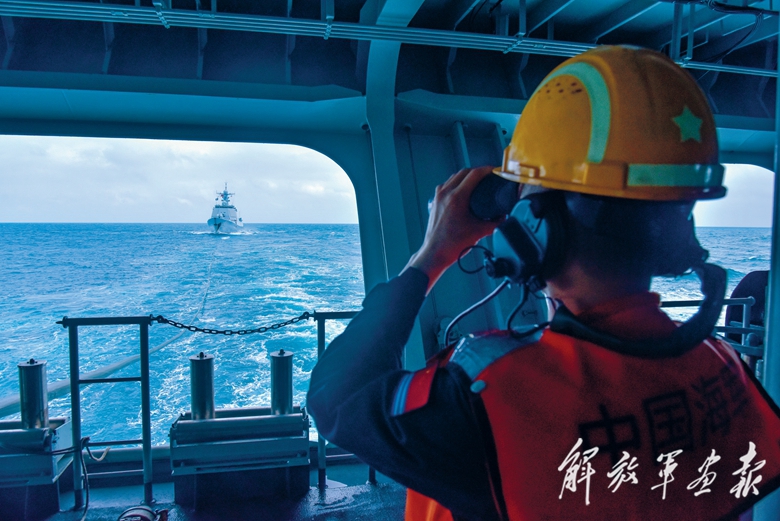 “海上補(bǔ)給部署!”受補(bǔ)驅(qū)逐艦快速組成補(bǔ)給隊(duì)形。查干湖艦甲板上,引纜繩在空中劃出一道弧線,承載索橋在兩艦之間凌空架起,對(duì)接、掃線、補(bǔ)給……一系列操作過(guò)后,“戰(zhàn)斗血液”汩汩注入受補(bǔ)驅(qū)逐艦。