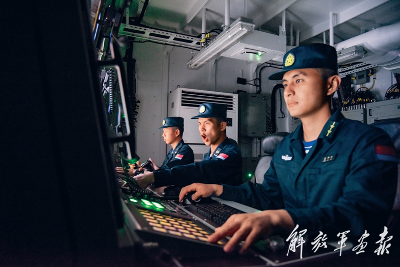 霎時(shí)間,急促的戰(zhàn)斗警報(bào)響徹海空。編隊(duì)各艦立即調(diào)整隊(duì)形,依次占領(lǐng)有利攻擊陣位;駕駛室內(nèi)各種信息交織匯總,電話聲、鍵盤聲此起彼伏,指揮口令不絕于耳。