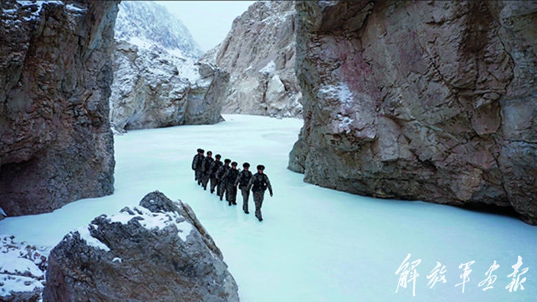 2023年2月3日,新疆和田軍分區(qū)河尾灘邊防連官兵在海拔5670米的某點位巡邏。(攝影/ 郭 帥)