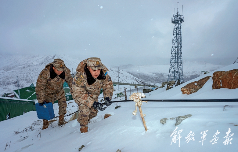 戰(zhàn)士劉博(前)、董圣雄冒著風(fēng)雪檢查通信線路。