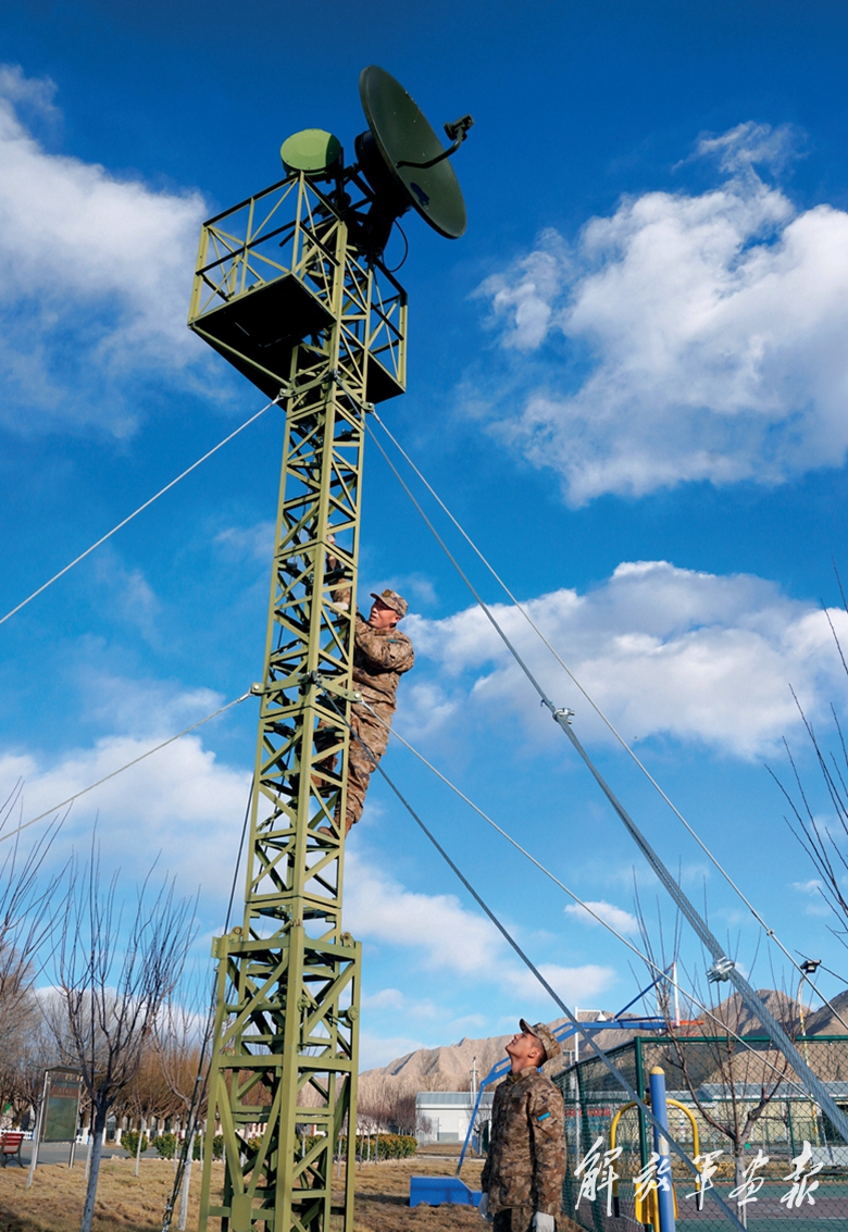 一級軍士長王勝全爬上微波天線架,檢修維護(hù)天線。