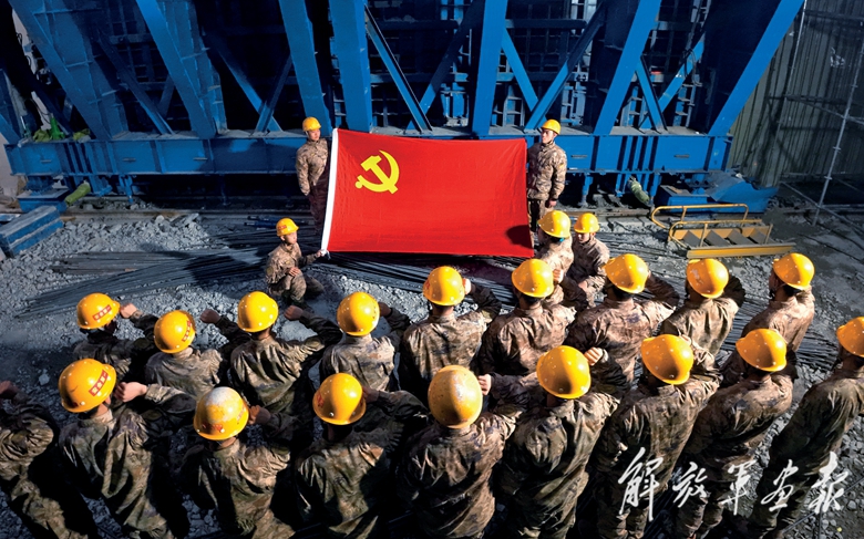 為攻克施工難關,黨員突擊隊沖鋒在前。圖為突擊隊成員面向黨旗宣誓,堅決如期完成施工任務。