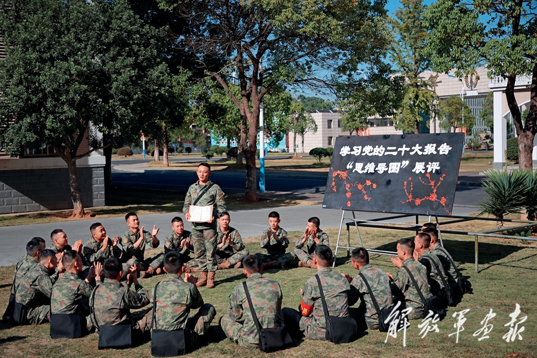 訓(xùn)練間隙,官兵針對黨的二十大報告有關(guān)國防和軍隊建設(shè)的內(nèi)容展開熱烈討論。