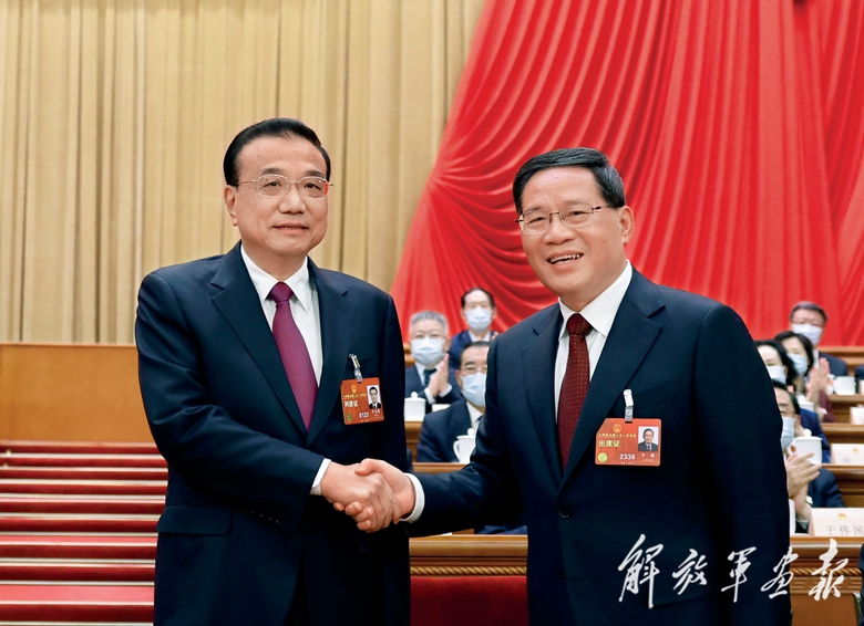 3月11日,十四屆全國人大一次會議在北京人民大會堂舉行第四次全體會議,根據(jù)國家主席習(xí)近平的提名,經(jīng)過投票表決,決定李強為中華人民共和國國務(wù)院總理。這是李強同李克強握手。(攝影/新華社記者 黃敬文)