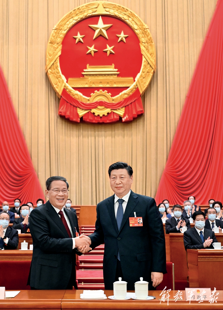 3月11日,十四屆全國人大一次會議在北京人民大會堂舉行第四次全體會議,根據(jù)國家主席習(xí)近平的提名,經(jīng)過投票表決,決定李強為中華人民共和國國務(wù)院總理。這是習(xí)近平同李強握手。(攝影/新華社記者 李學(xué)仁)