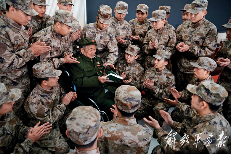 97歲的老英雄孟昭身為預(yù)定新兵講革命傳統(tǒng),并向新戰(zhàn)友贈(zèng)送紅色書(shū)籍。