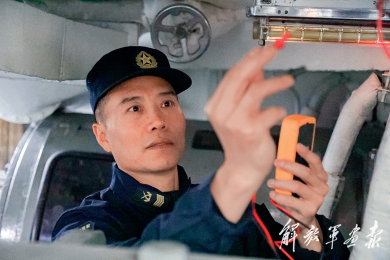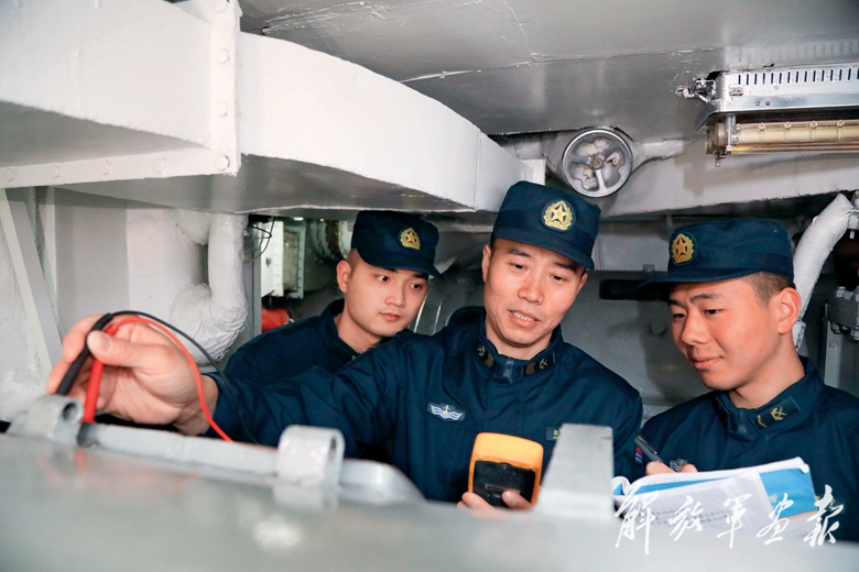 軍港內(nèi),潛艇伏波靜臥,海浪輕拍著艇體。剛剛出海歸來(lái)的海軍某潛艇基地“水下先鋒艇”一級(jí)軍士長(zhǎng)、電工班班長(zhǎng)郭金海,正和戰(zhàn)友檢查裝備。