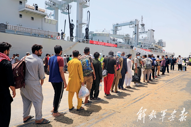 應(yīng)有關(guān)國家請求,第二批緊急撤離任務(wù)還轉(zhuǎn)運來自巴基斯坦、巴西等國人員221人。 圖為隨微山湖艦撤離的外籍人員準(zhǔn)備登艦。 (攝影/李怡諾)