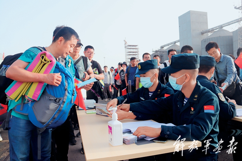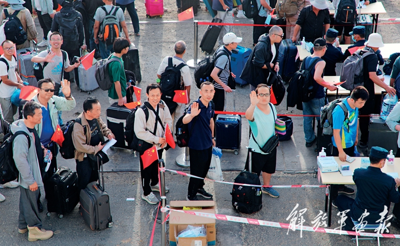 撤離人員有序辦理手續(xù),準(zhǔn)備登艦撤離。(攝影/丁家興)
