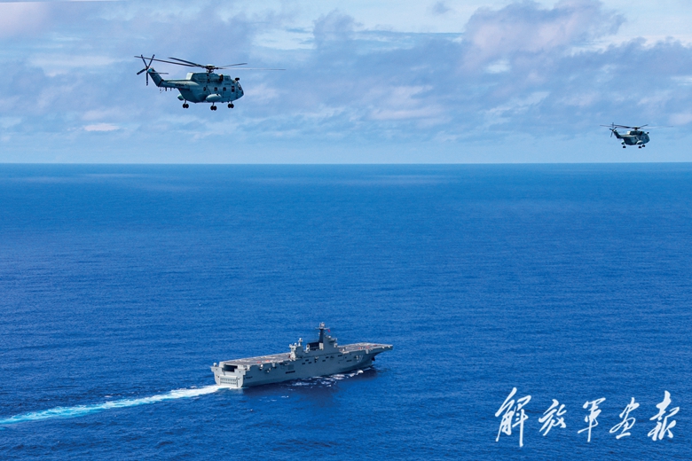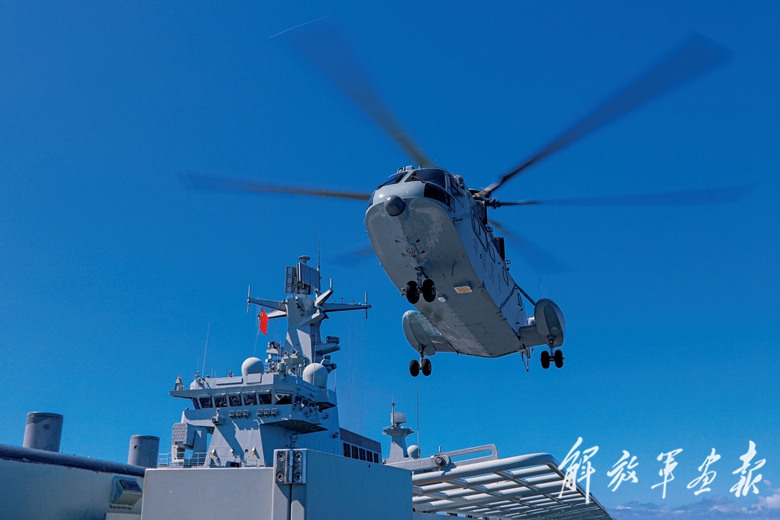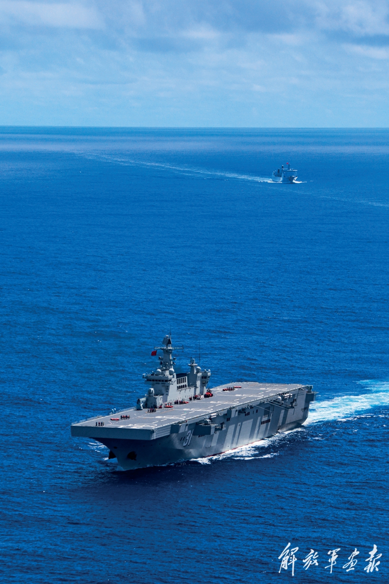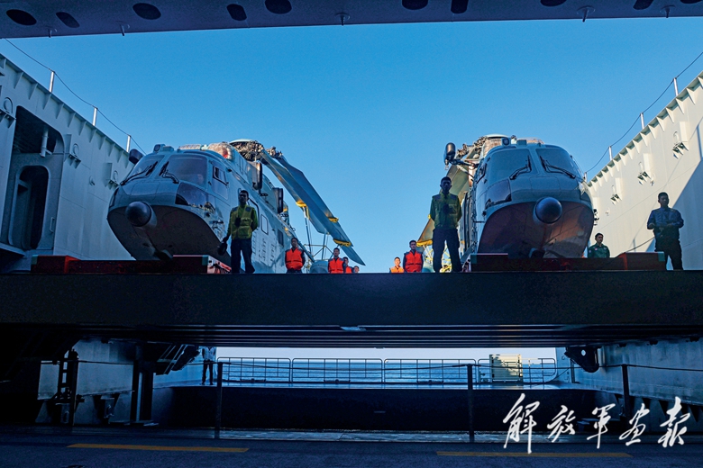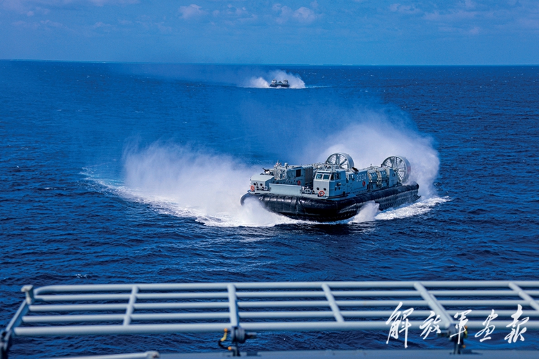 “‘?dāng)场溲b兵力登陸我無人島礁,上級令我輸送登陸兵力,對其實施打擊!”新的“敵情”傳來。甲板上,數(shù)架艦載直升機(jī)鐵翼飛旋、蓄勢待發(fā);塢艙內(nèi),氣墊艇燃機(jī)轟鳴,嚴(yán)陣以待……
