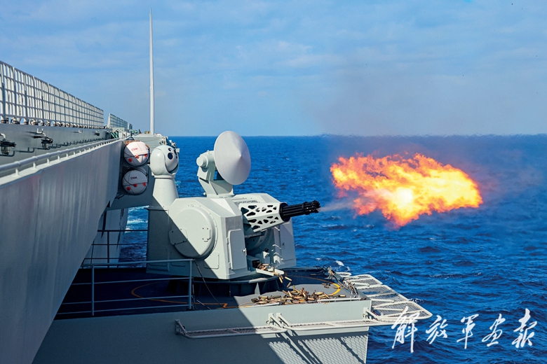 不遠(yuǎn)處,2架高速靶機(jī)正高速抵近。指揮員凝神注視雷達(dá)屏幕上閃動的光標(biāo),果斷下達(dá)指令:“做好對空抗擊準(zhǔn)備!”靶機(jī)進(jìn)入射程后,左舷副炮立即開火,在海天之間織出一道密集火力網(wǎng)。霎時間,2架靶機(jī)被精準(zhǔn)命中,“敵情”危機(jī)解除。