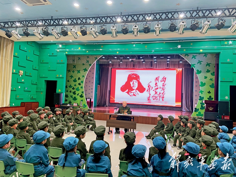 93歲高齡的老將軍姜洪祥為幼兒園小朋友講述雷鋒故事。