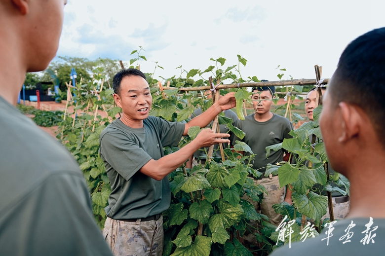 楊曉明(左二)向年輕官兵傳授種植經(jīng)驗。
