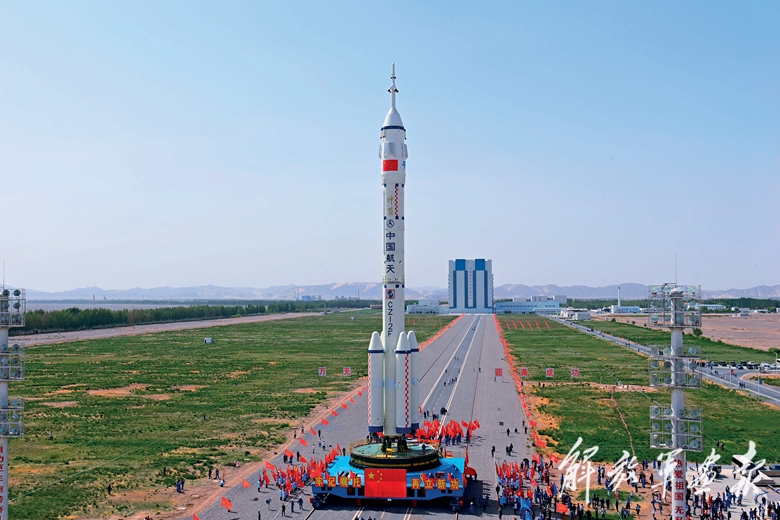 5月22日,神舟十六號(hào)載人飛船與長(zhǎng)征二號(hào)F遙十六運(yùn)載火箭組合體準(zhǔn)備轉(zhuǎn)往發(fā)射場(chǎng)。(攝影/汪江波)