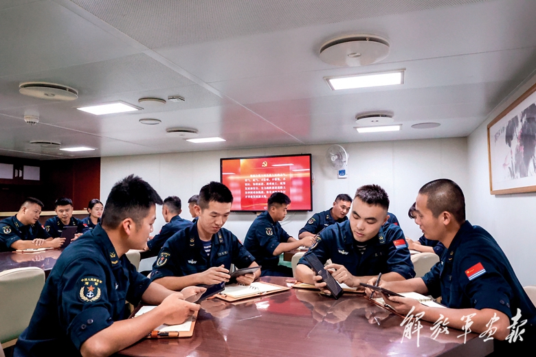 “堅(jiān)定不移聽(tīng)黨話、跟黨走,努力鍛造過(guò)硬勝戰(zhàn)本領(lǐng),將忠誠(chéng)寫(xiě)在深藍(lán)航跡之上,官兵們鐵心向黨的信仰之火越燃越旺!”編隊(duì)領(lǐng)導(dǎo)介紹,編隊(duì)臨時(shí)黨委堅(jiān)持把學(xué)習(xí)宣傳貫徹黨的二十大精神貫穿任務(wù)全程、融入護(hù)航實(shí)踐。他們大力開(kāi)展學(xué)習(xí)宣傳貫徹二十大精神教育實(shí)踐活動(dòng),并通過(guò)舉辦黨員宣誓簽名、升國(guó)旗等活動(dòng),進(jìn)一步增強(qiáng)官兵的榮譽(yù)感和使命感。