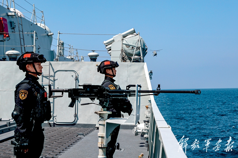 2022年10月30日,第42批護(hù)航編隊(duì)在亞丁灣執(zhí)行護(hù)航任務(wù),特戰(zhàn)隊(duì)員進(jìn)行警戒執(zhí)勤。