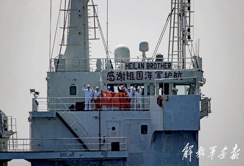 2022年11月5日,第42批護(hù)航編隊(duì)護(hù)送貨船安全通過(guò)亞丁灣。圖為被護(hù)貨船船員向護(hù)航編隊(duì)官兵揮手致謝。