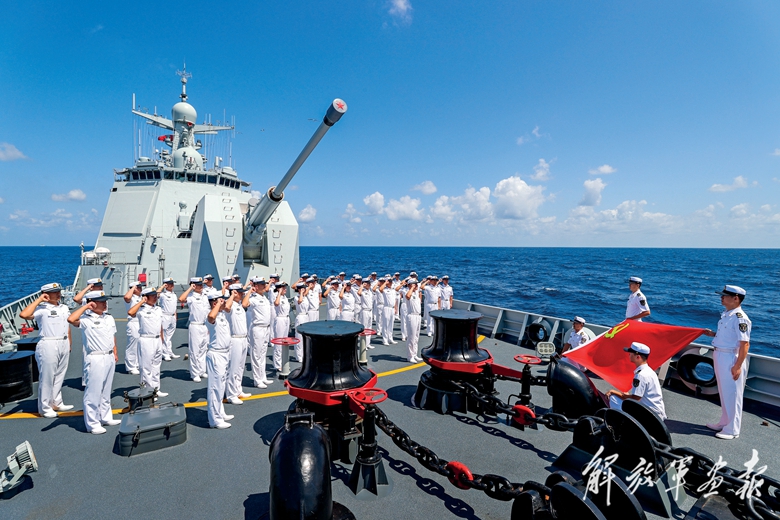 2022年10月16日,淮南艦在執(zhí)行任務(wù)途中組織向黨旗宣誓儀式。