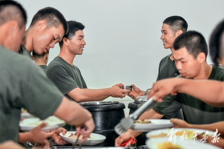 連長為新下連戰(zhàn)士端上一碗熱湯。