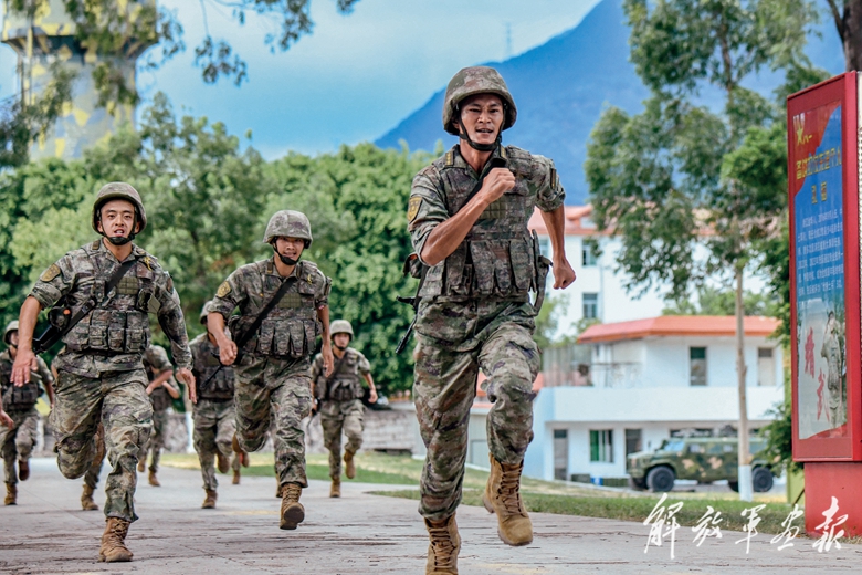 武裝5公里訓(xùn)練中,官兵你追我趕。