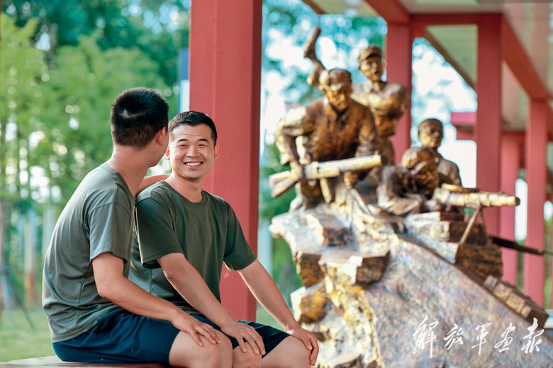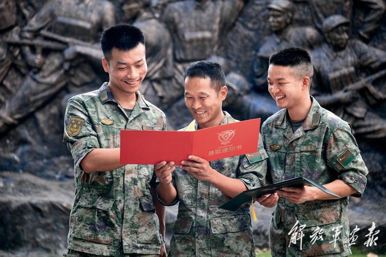 戰(zhàn)士收到軍校錄取通知書,第一時(shí)間將好消息與班長(中)分享。