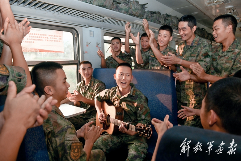 機(jī)動(dòng)途中,官兵在車廂里即興彈唱活躍氛圍。