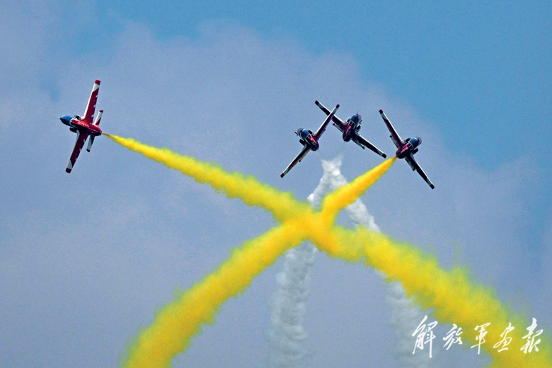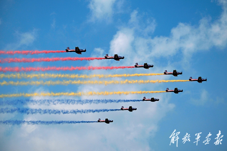 7月27日,空軍航空開放活動·長春航空展首個公眾日??哲姟鞍艘弧憋w行表演隊選用代表空軍軍旗色彩的紅、黃、藍三色拉煙,紀念抗美援朝戰(zhàn)爭勝利70周年。