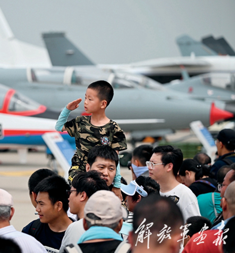 空軍航空開放活動·長春航空展首個公眾日上,一名男孩向空軍戰(zhàn)機敬禮。