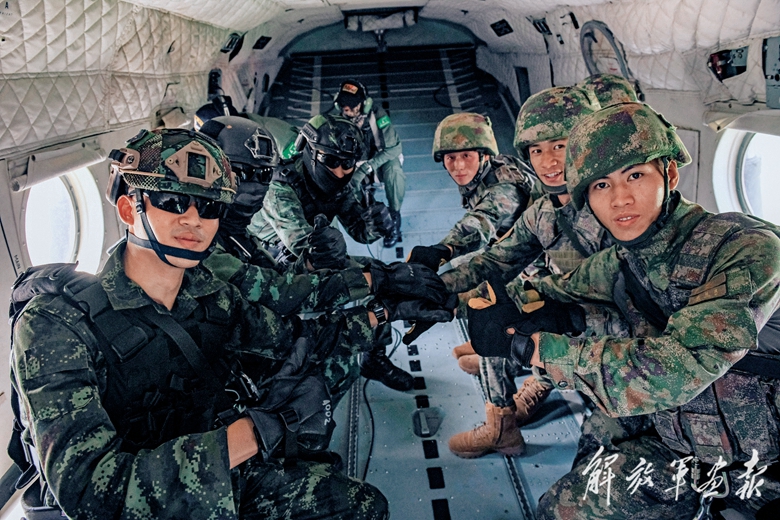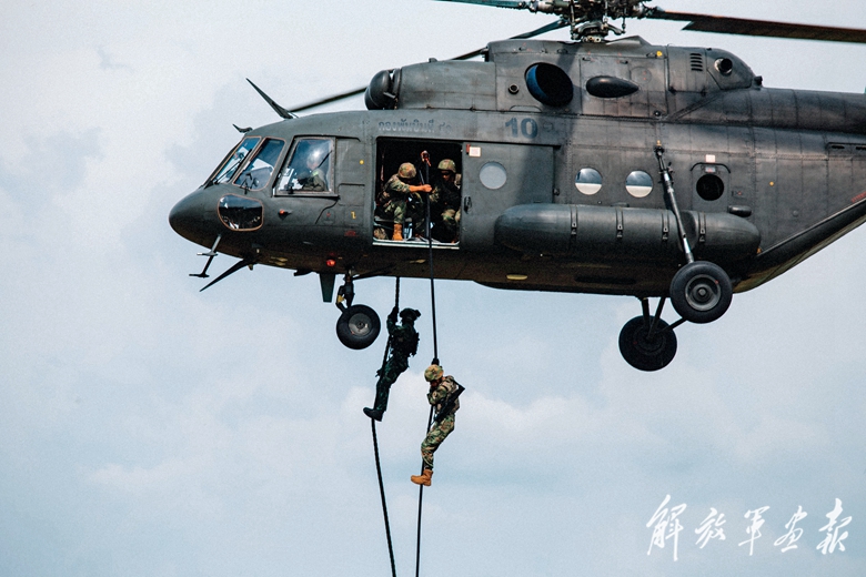 雙方參訓(xùn)官兵進(jìn)行直升機(jī)雙門機(jī)降訓(xùn)練。