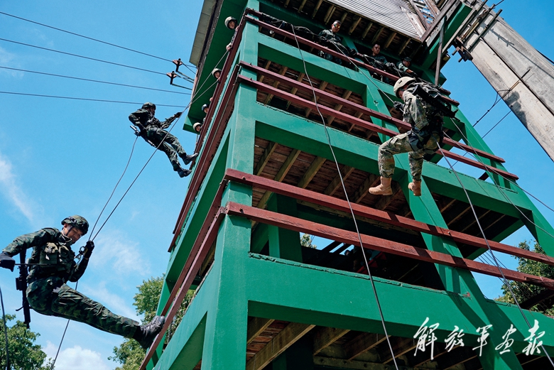 雙方參訓(xùn)官兵開展攀登滑降訓(xùn)練。
