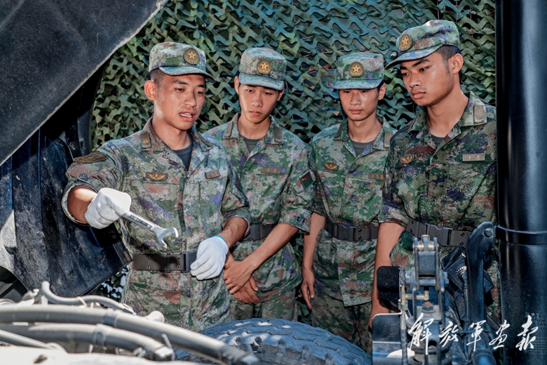 “尊干愛(ài)兵標(biāo)兵連”骨干為新戰(zhàn)友講解車輛維修流程。