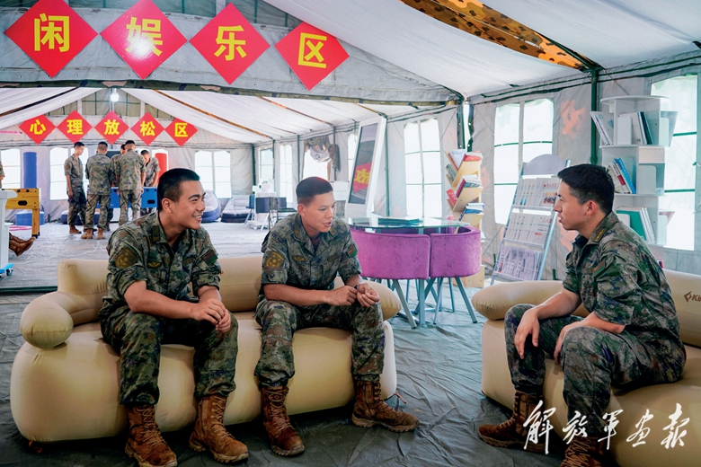 野外駐訓(xùn)期間,連隊(duì)骨干在野戰(zhàn)文化帳篷里與戰(zhàn)士談心交流。