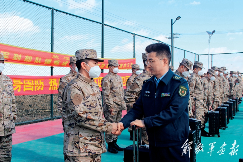 在舒蘭市2023年上半年入伍新兵歡送儀式上,周昆訓(xùn)為新兵贈送入伍紀(jì)念品。(舒蘭市人武部提供)