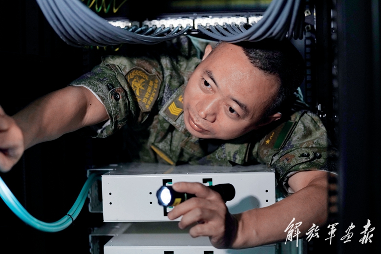 面對眼前不停閃爍的通信設(shè)備和密密麻麻的接線端口,南部戰(zhàn)區(qū)某部一級軍士長、通信技師葉升學運指如飛,將海量“戰(zhàn)場態(tài)勢”數(shù)據(jù)源源不斷地匯集到戰(zhàn)區(qū)聯(lián)指中心。指揮員迅速定下戰(zhàn)斗決心,一條條作戰(zhàn)指令隨即傳達至演訓一線……